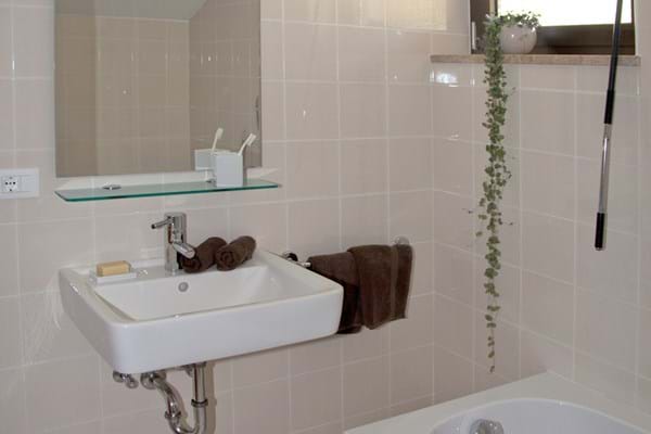 Das moderne Bad bietet Behaglichkeit und Komfort mit Badewanne, Dusche, WC, Bidet und Waschbecken mit Ablage.