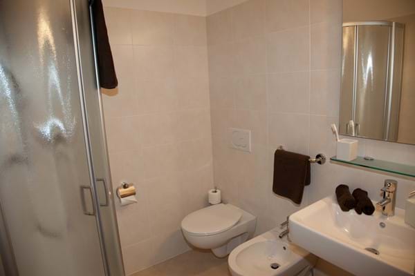 Das moderne Bad bietet Behaglichkeit und Komfort mit Dusche, WC, Bidet und Waschbecken mit Ablage.