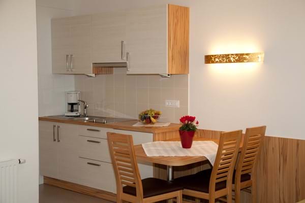 Die lichtdurchflutete Ferienwohnung bietet einen großen, gemütlichen Wohn-Schlafraum, eine moderne Küchenzeile mit Esstisch und Stühlen, ein geräumiges Bad und einen sonnigen Süd-Balkon (insg. ca. 40 m2).